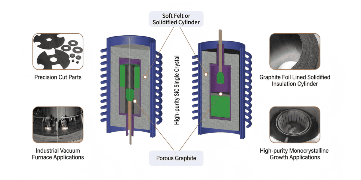 अर्धचालक उत्पादन:यो मोनोक्रिस्टलाइन सिलिकन र SiC क्रिस्टल वृद्धि फर्नेस सेटअपहरूको लागि मुख्य इन्सुलेशन तह हो।